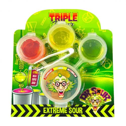 Dr Sour Tripple Dipper är en godis från Dr Sour och behåller märkets sedvanliga surhet men med en unik twist. Den kommer nämligen i ett litet DIY-set. Tre burkar med sur gel i smakerna citron, vattenmelon och jordgubb. Du använder dig av den medföljande pincetten för att doppa gelégodisarna i de olika gel-burkarna för att skapa egna sura smakkombinationer.