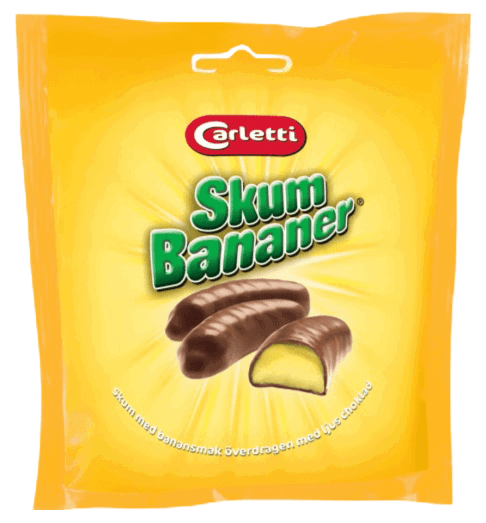 Carletti Skumbananer är mjuka marshmallows med banansmak doppade i härlig ljus choklad. En frukt passande en gottegris!