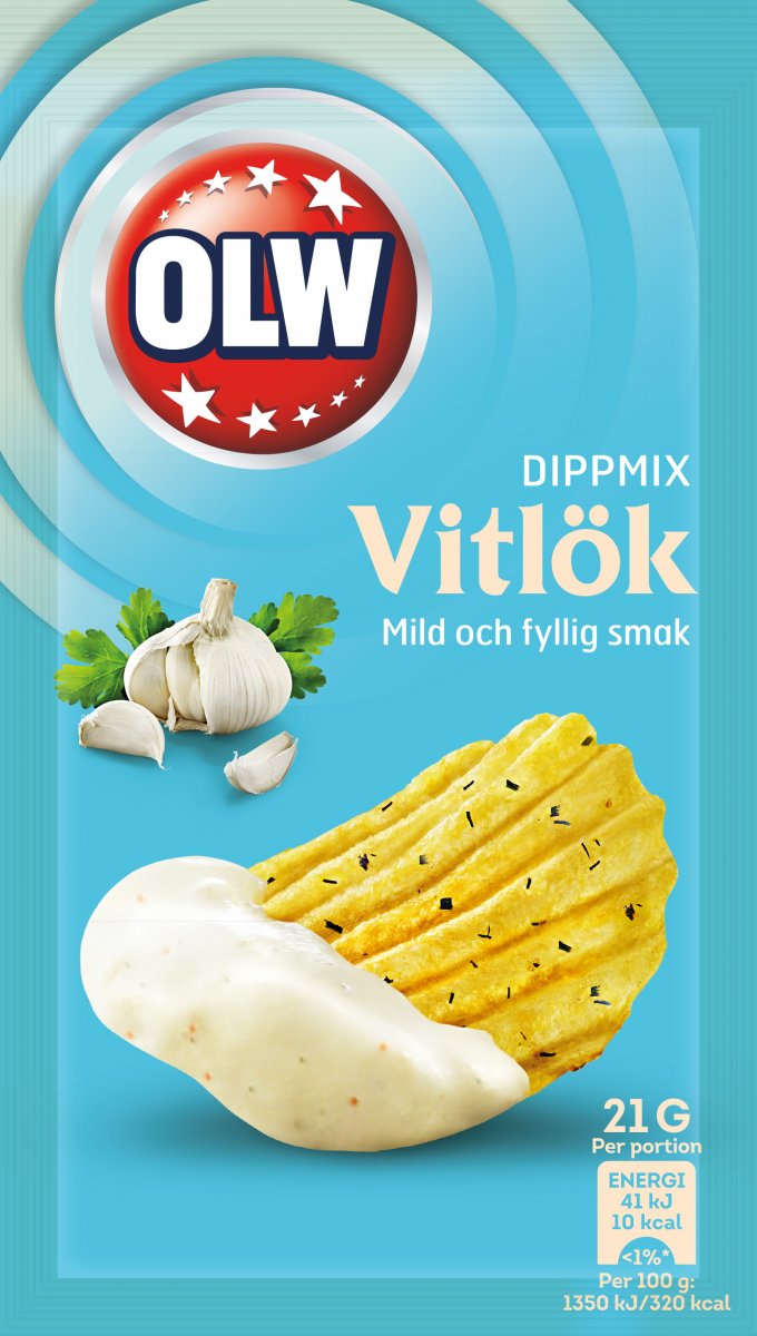 OLWs dippmix Vitlök. En mild och fyllig vitlöksdipp som passar lika perfekt till grönsaksstavar som till chips.