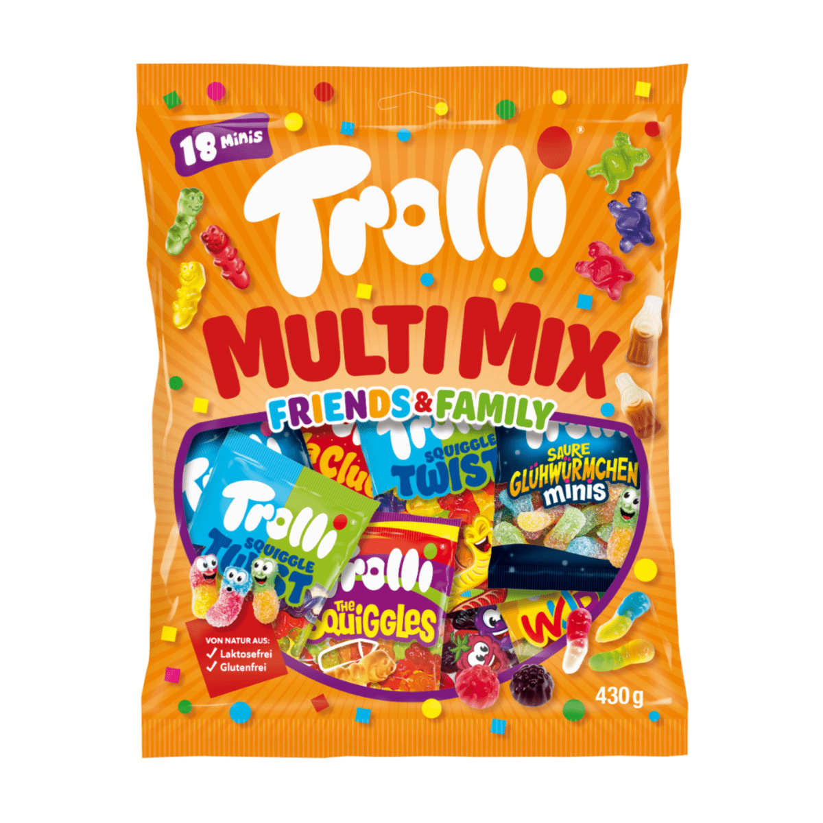 Trolli MultiMix Friends & Family är den perfekta godisblandningen för alla tillfällen! Denna mångsidiga mix med 18 små påsar innehåller en variation av Trollis bästsäljande godisar, från sura regnbågsmixar till mjuka gelégodisar och mycket mer. Perfekt för att dela med familj och vänner eller för att njuta av ensam.