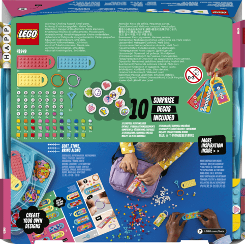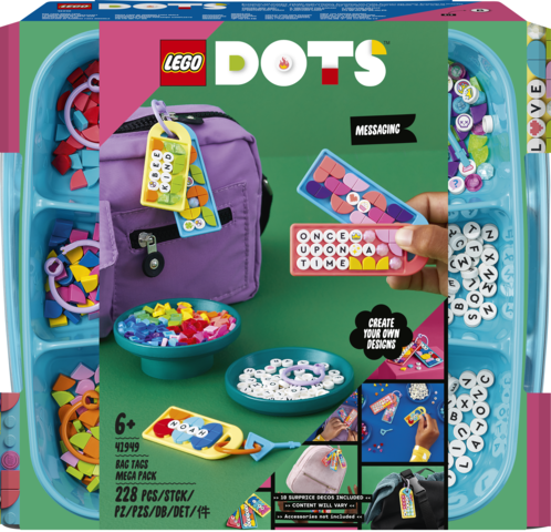 LEGO-setet Dots bagagetaggar storpack innehåller 5 taggar och över 200 färgplattor och bokstäver.