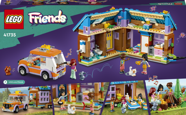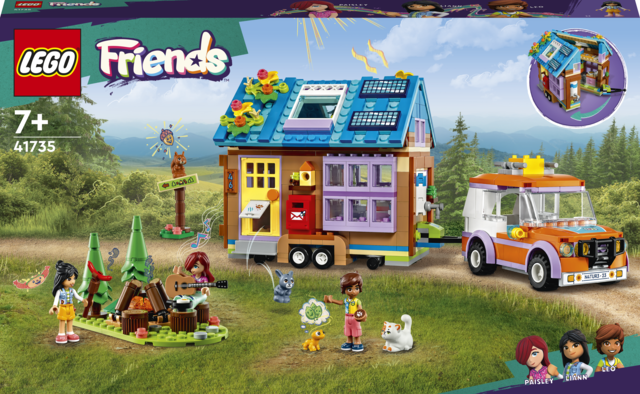 LEGO-setet Friends Mobila Minihuset innehåller Minihus på hjul, bil, lägerplats, skylt, gitarr, korv, grillspett, katt, kanin, ödla, ekorre och tre minifigurer: Paisley, Liann och Leo