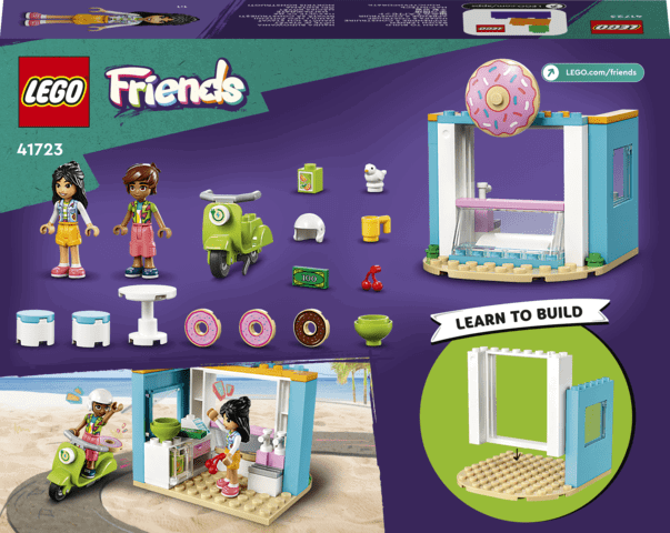 LEGO-setet Friends Munkbutik innehåller en munkbutik, en skoter, en hjälm, bord, två stolar, en fågel, en mugg, 3 munkar, sedel och 2 minifigurer: Liann och Leo.