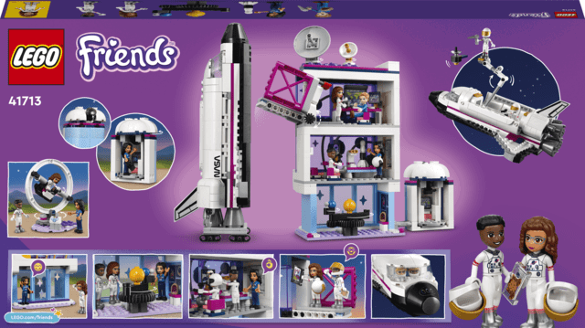 LEGO-setet Friends Olivias rymdskola innehåller rymdfärja, observatorium, multiaxelsimulator, skola med klassrum och ledningscentral och fyra minidockor: Olivia, William, Julian och doktor Vidya.