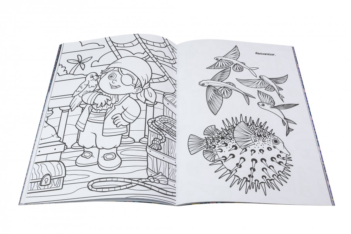 Följ med piraterna ut på havet med de skojiga bilderna i den här målarboken. Boken innehåller allt från pirater till häftiga djuphavsfiskar så det är bara att välja motiv och sedan låta fantasin och färgerna flöda fritt.