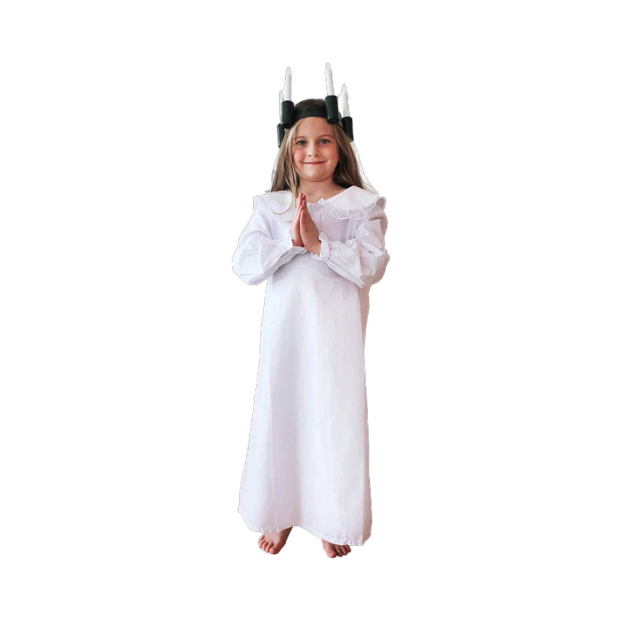Ett vitt, klassiskt lucialinne för barn med spetsdetaljer på kragen.