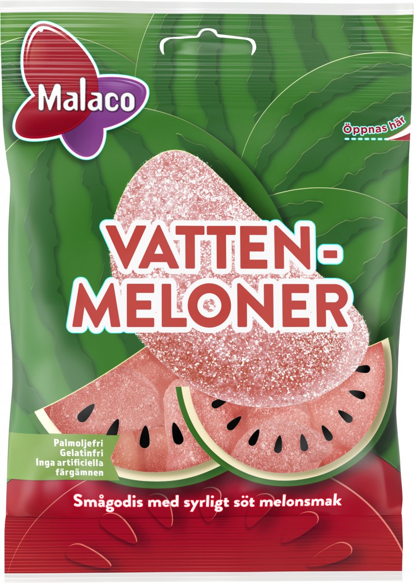 Malaco Vattenmeloner är ett sursockrat smågodis med den friska smaken av vattenmelon. Ett syrligt och sött godis till helgen eller arbetspausen.