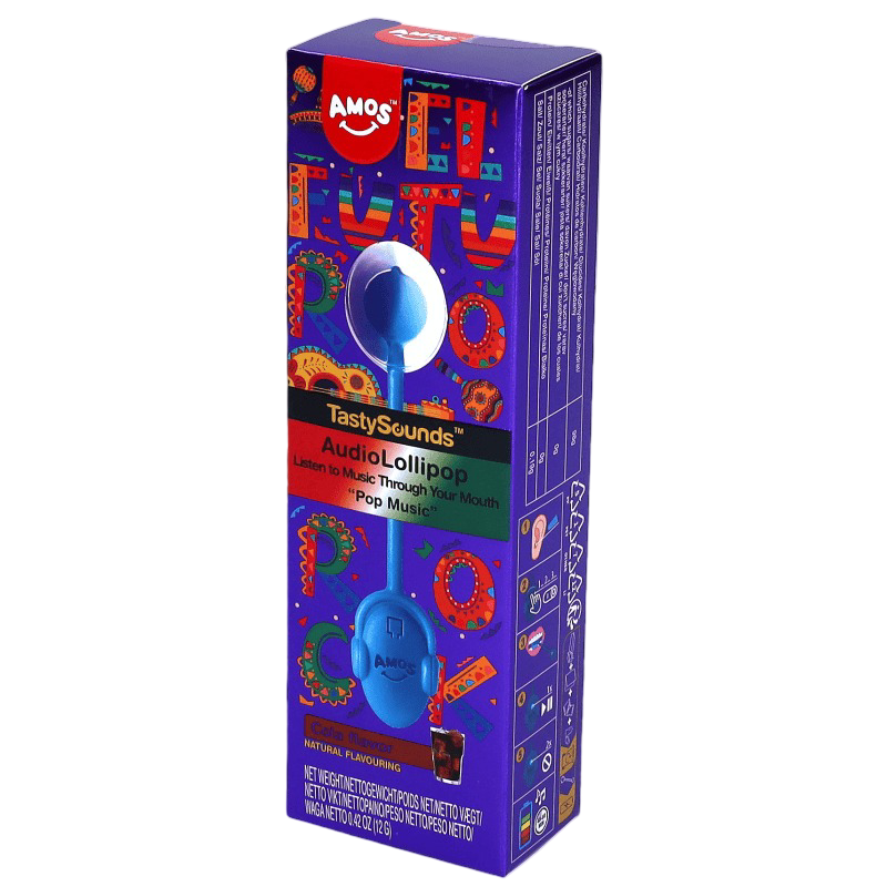 Den här innovativa audio-lollipopen använder benledningsteknik för att sända ljudvibrationer genom klubban och upp till dina öron medan du njuter av godiset – så du ”hör” musiken samtidigt som du smakar på smaken. Perfekt som present, för fest, eller som en rolig snackupplevelse för både barn och vuxna som vill prova något helt nytt.