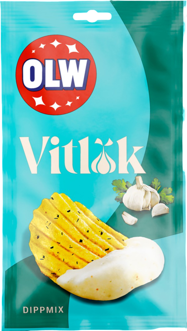 OLWs dippmix Vitlök. En mild och fyllig vitlöksdipp som passar lika perfekt till grönsaksstavar som till chips.
