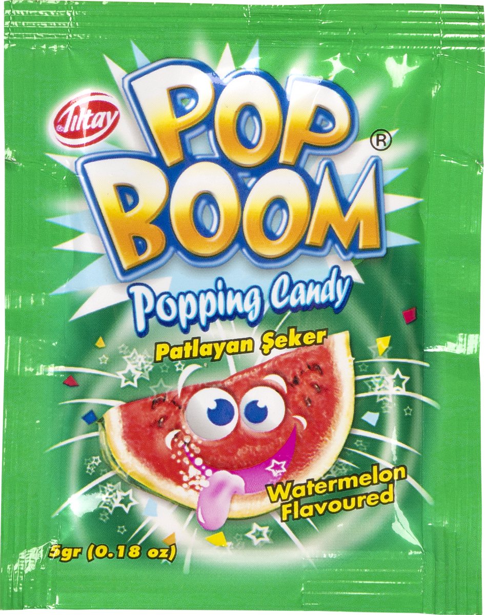 POP BOOM Popping Candy Watermelon är ett godis med uppfriskande smak av vattenmelon som smäller och knastrar när det får kontakt med tungan.