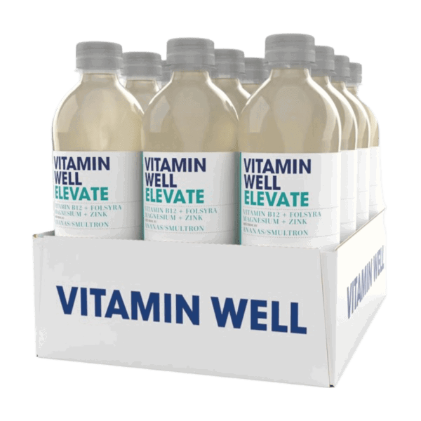 Vitamin Well Elevate, med smak av ananas och smultron, är en vitamindryck som innehåller vitamin B12, folsyra och magnesium som minskar trötthet och utmattning. Den innehåller även zink för immunsystemets funktion och magnesium för normal muskelfunktion.